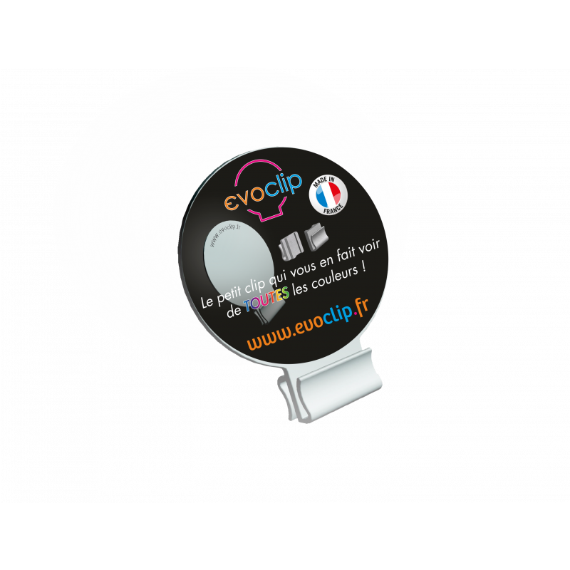 EVOCLIP PERSO est un clip transparent Ø 50 mm, une solution de «mise en valeur», par stickers PERSONNALISABLES, sur clip-macaron promo amovible, conçu pour :