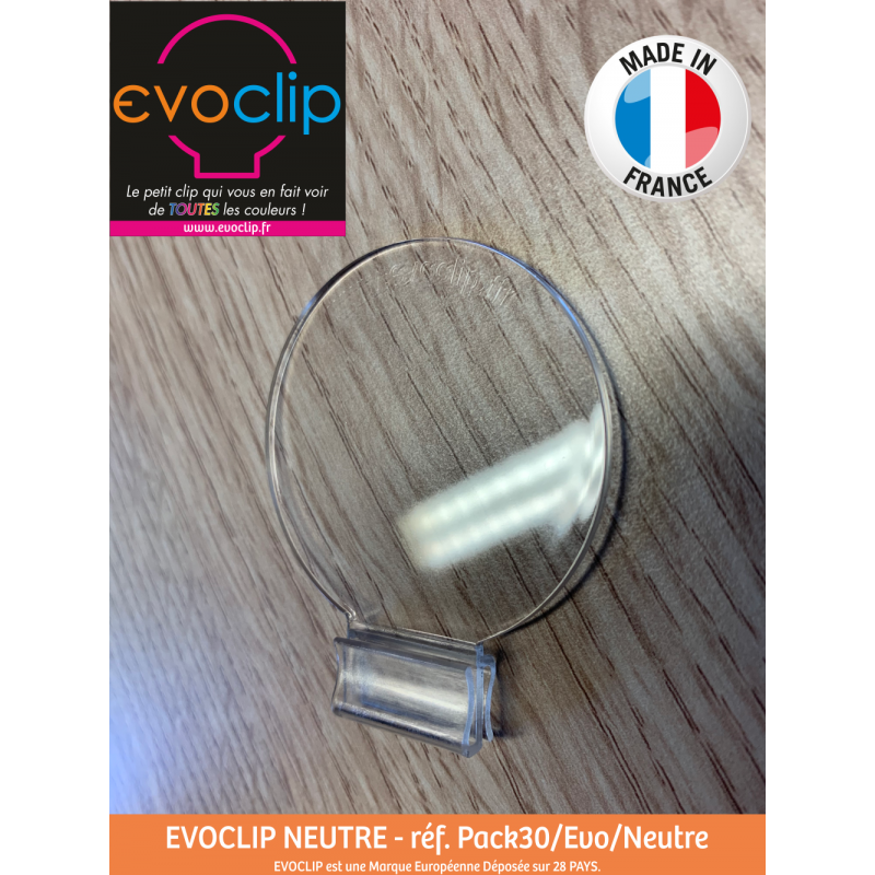EVOCLIP est un clip transparent, une solution de « mise en valeur », par stickers PROMO, sur clip-macaron promo amovible, conçu pour :