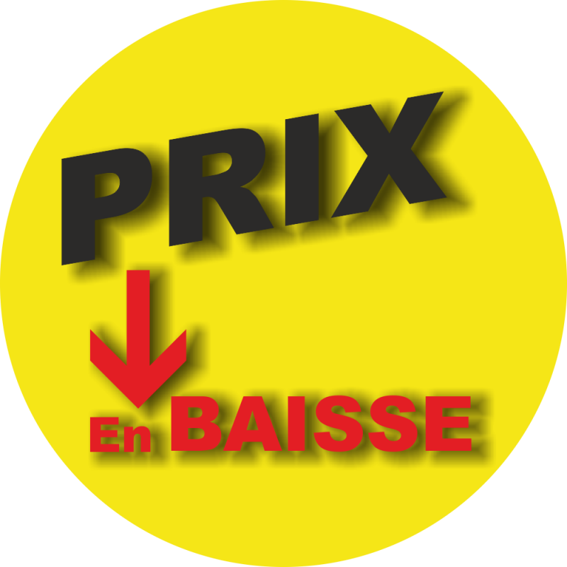 Notre adhésif P.L.V Displays PRIX EN BAISSE fond jaune, est imprimé, puis pelliculé, pour une protection optimale, et... un Entretien efficace et rapide...