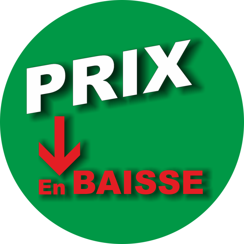 Notre adhésif P.L.V Displays PRIX EN BAISSE fond vert, est imprimé, puis pelliculé, pour une protection optimale, et... un Entretien efficace et rapide...